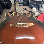 トップ板のはがれですが、お客様ご自身で接着剤&ガムテープ修理がされていましたので、まず、できる限りきれいにしていってからの接着なのですが、オベーションはクランプが難しい・・・。写真にはあまり苦労感というのが伝わらないのが残念なところ・・・。